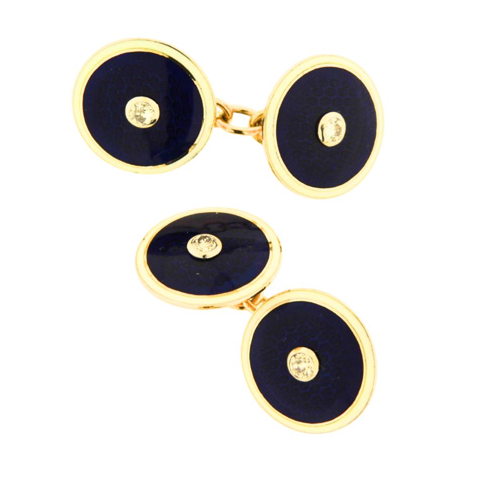 A vintage 18ct gold blue and white enamel cufflinks set with 4 x 0.07ct diamonds, total 0.28ct.  Size 1.5cms