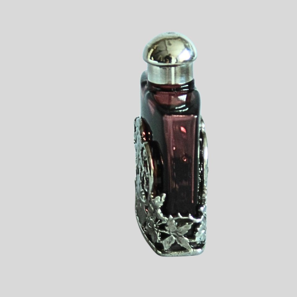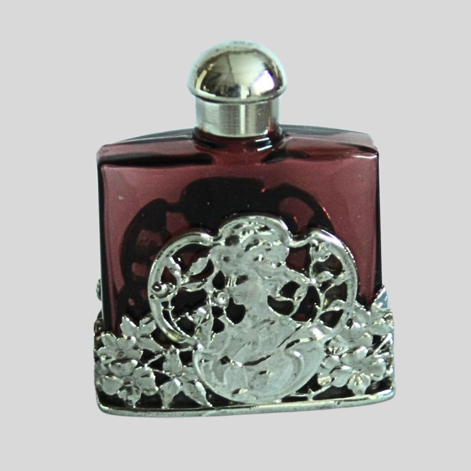A vintage electroplated coloured glass perfume bottle.  6cms x 4cms